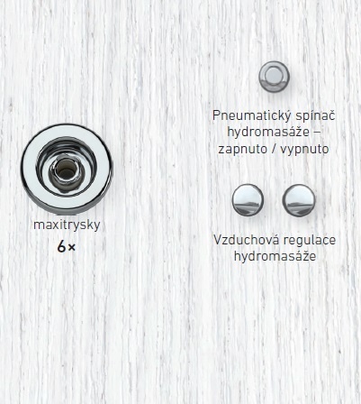 Komponenty v provedení chrom, 6ks maxitrysek (vlastní regulace směru a intenzity proudu), pneumatické ovládácí prvky, vzduchovou regulaci, čerpadlo, montážní prvky